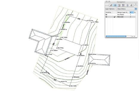 - Puntos 3D. Estos puntos en 3D deben incluir el valor apropiado Z para el terreno donde el punto fue marcado. Para simplificar el trabajo, asegurarse que aquella información que no forma parte del terreno (p.e. alturas de edificaciones o aleros) se incluyan en una clase aparte (o layer de AutoCAD) de esta manera puede ser excluido de los datos para el modelo. Cada punto de AutoCAD será convertido a un 3D Locus en Vectorworks y usado como fuente para el modelo de terreno. El cual será triangulado desde estos puntos y se producirá un modelo sólido en 3D y un plano con curvas de nivel.