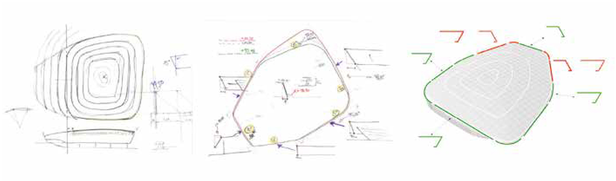 Un reto especial fue el comienzo de la fase de planificación, la búsqueda de la geometría de la forma de la envolvente. La forma exacta en que se determina por varios radios y ángulos de inclinación y la forma del edificio del proyecto definidas con precisión como se tradujo en una geometría construible. Dependiendo de techos e instalaciones técnicas, a continuación, se definen y optimizan las geometrías de cubierta y fachada.