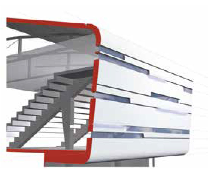 La cooperación con consultores especializados externos también trabajó sin problemas, ya que estos sus planes comenzaron en 3D . La geometría 3D- podría ser fácilmente asumida por el ingeniero estructural que desarrolló la estructura de acero y los detalles de la conexión en 3D y 2D. La integración de la planificación en 3D de la estructura de acero y una coordinación óptima de diversos oficios logró una enorme reducción de las volúmenes de obra y por lo tanto también se podrían alcanzar los costos.
