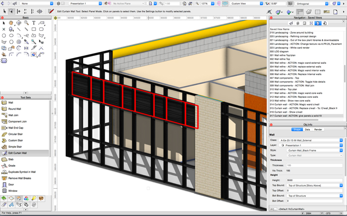 Patel explicó cómo un enfoque de «refinar» y no «remodelar» permite a las empresas «iniciar BIM al principio» Patel utilizó Vectorworks para avanzar en la creación de estudios de masas tempranas (LoD 100), refinando el modelo para el diseño desarrollado con paredes de concepto, losas, etc. (LoD 200) y luego pasando al diseño técnico para mostrar la intención de construcción (LoD 300).
