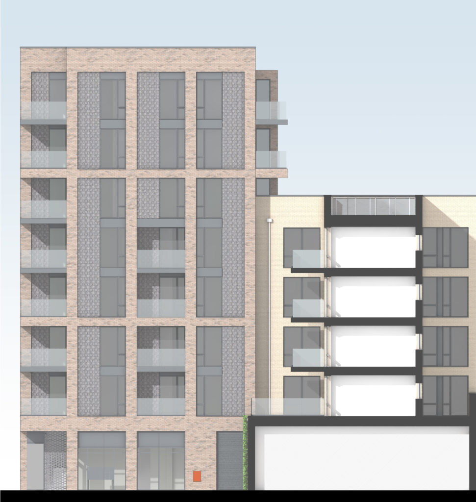 Con el proyecto Orangery Lane similar en el distrito de Greenwich, Yurky Cross tuvo que prestar aún más atención a cómo su diseño afectaría la estética del entorno, particularmente porque había un edificio protegido frente al sitio del proyecto. «Fue un poco polémico, y hubo muchas opiniones diferentes sobre cómo deberíamos acercarnos al diseño», dijo Cross. La pregunta principal fue si el proyecto, que comprende 46 apartamentos nuevos y 278 m2 de espacio comercial, debería combinarse con el edificio histórico o tratar de distinguirse. Esta fue una pregunta que el panel de diseño de Greenwich, organizado por los planificadores en asociación con la Comisión de Arquitectura y Medio Ambiente Construido (CABE) acaloradamente debatió. Nuestras propuestas de diseño reflejan su aporte.