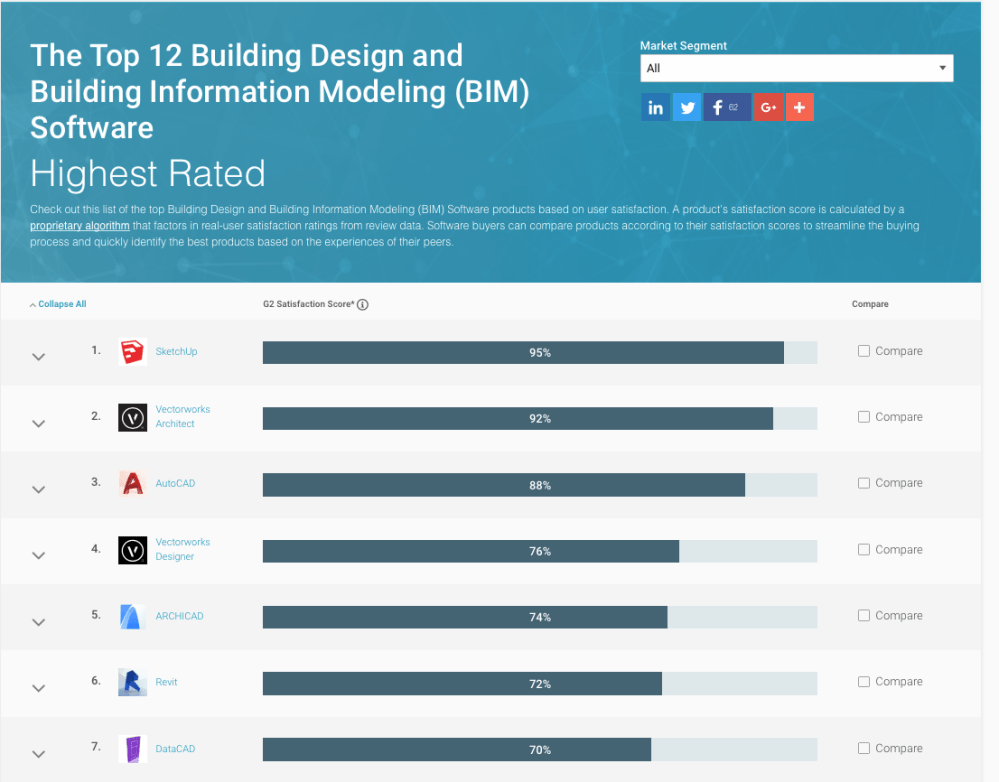 Los informes clasifican el software en base a revisiones imparciales y en tiempo real de usuarios verificados. Vectorworks Architect ocupó el segundo lugar en las categorías de «Calificación más alta » y «Más fácil de usar » para el diseño de edificios y el software de modelado de información de edificios (BIM). Calificado por delante de otros programas de software BIM, Vectorworks Architect recibió un puntaje de satisfacción del 92 por ciento y un puntaje de usabilidad de 8.5 sobre 10.