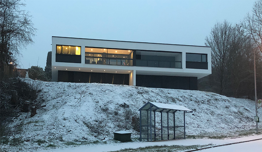 El edificio es una casa adosada invertida. El piso superior forma un dosel, que se utiliza como una cochera. Un volado se proyecta en todas las demás direcciones y proporciona protección contra el sol y la lluvia para las terrazas y el acceso a los apartamentos inferiores.