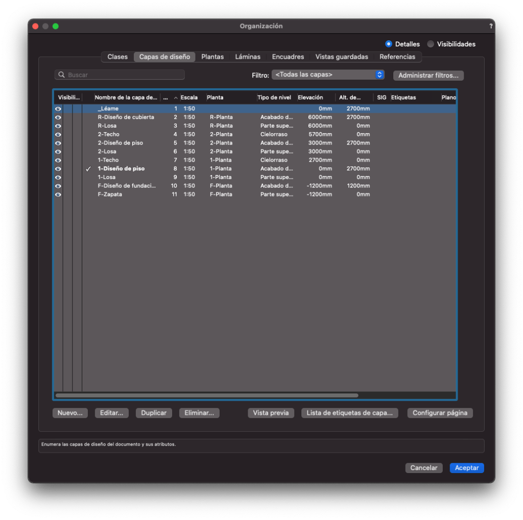 Se recomienda colocar las capas verticalmente, es decir, el piso uno sobre la losa, el piso dos sobre el piso uno, y así sucesivamente. Haga esto configurando la elevación de la capa en el cuadro de diálogo Organización. Este método generará automáticamente capas a la altura correcta para usted.