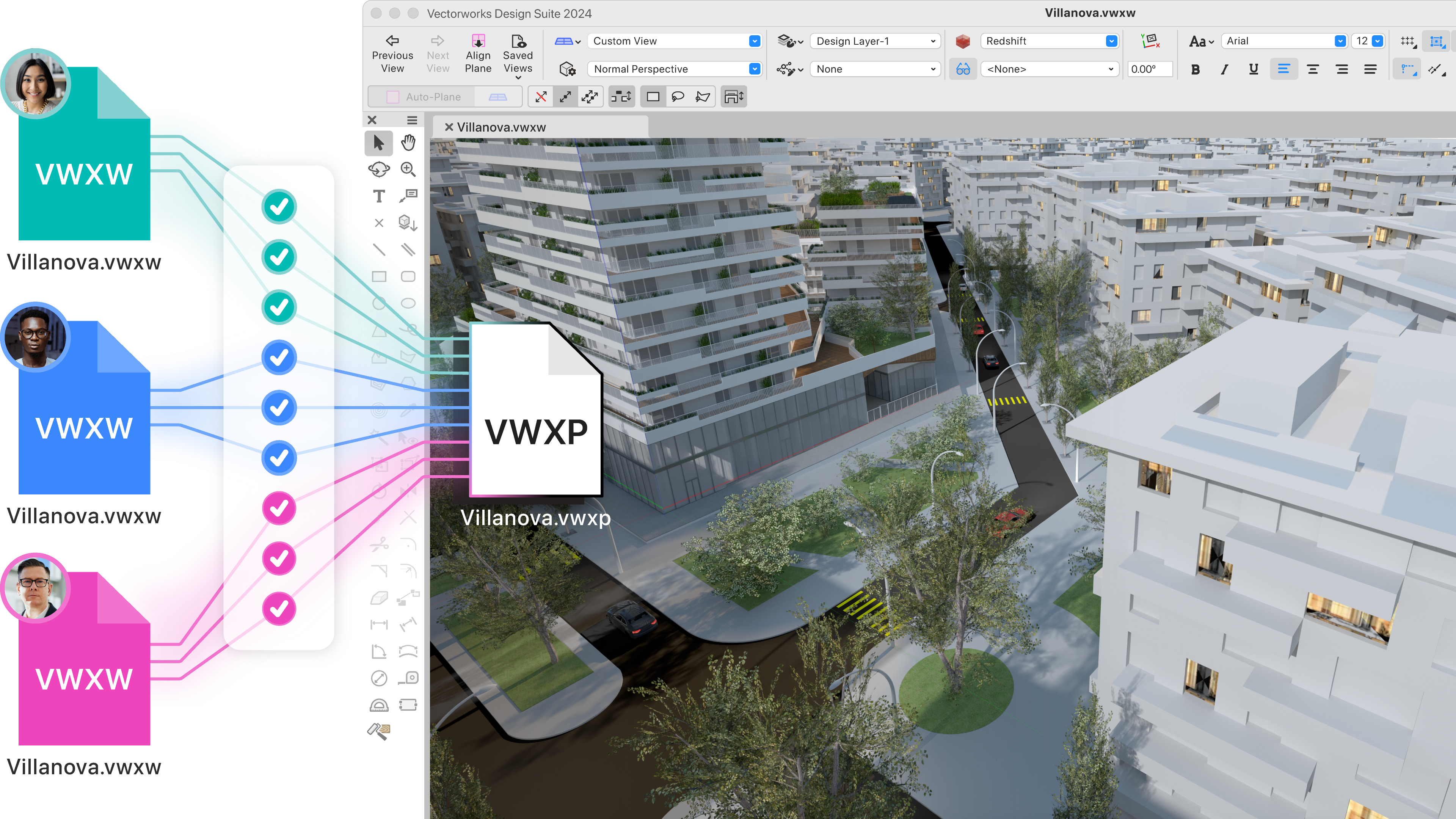 Vectorworks posee una característica genial para trabajar colaborativamente, Compartir Proyectos (Project Sharing) que es un entorno multiusuario que se utiliza para colaborar simultáneamente en el mismo archivo al mismo tiempo, independientemente de la ubicación.